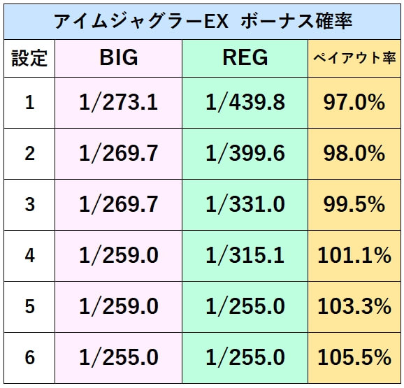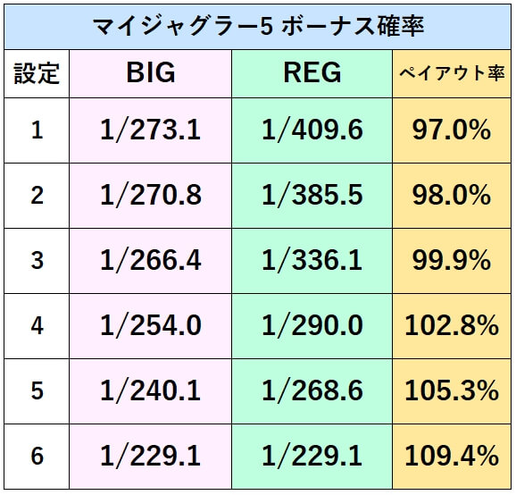 ここで注目すべきはBIGとREGの比率ではなく、各ボーナスの設定毎の確率差。